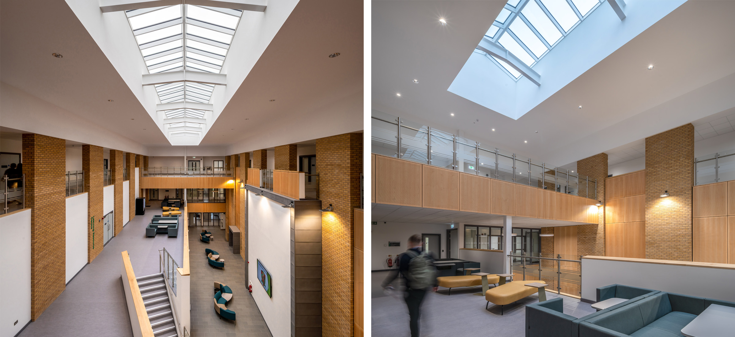 An impressive multi-million pound c16,000m2 school for 1,300 pupils constructed on an existing 13-acre site to deliver a three-storey complex ranged around a central courtyard, with two spacious atria within north and south wings, and single storey Sports and Technology annexes complemented by a 3G full-size GAA pitch, all stunningly designed to harmonise with the rolling hills of the Sperrin Mountains. Photo Credits: Gareth Andrews Photography.