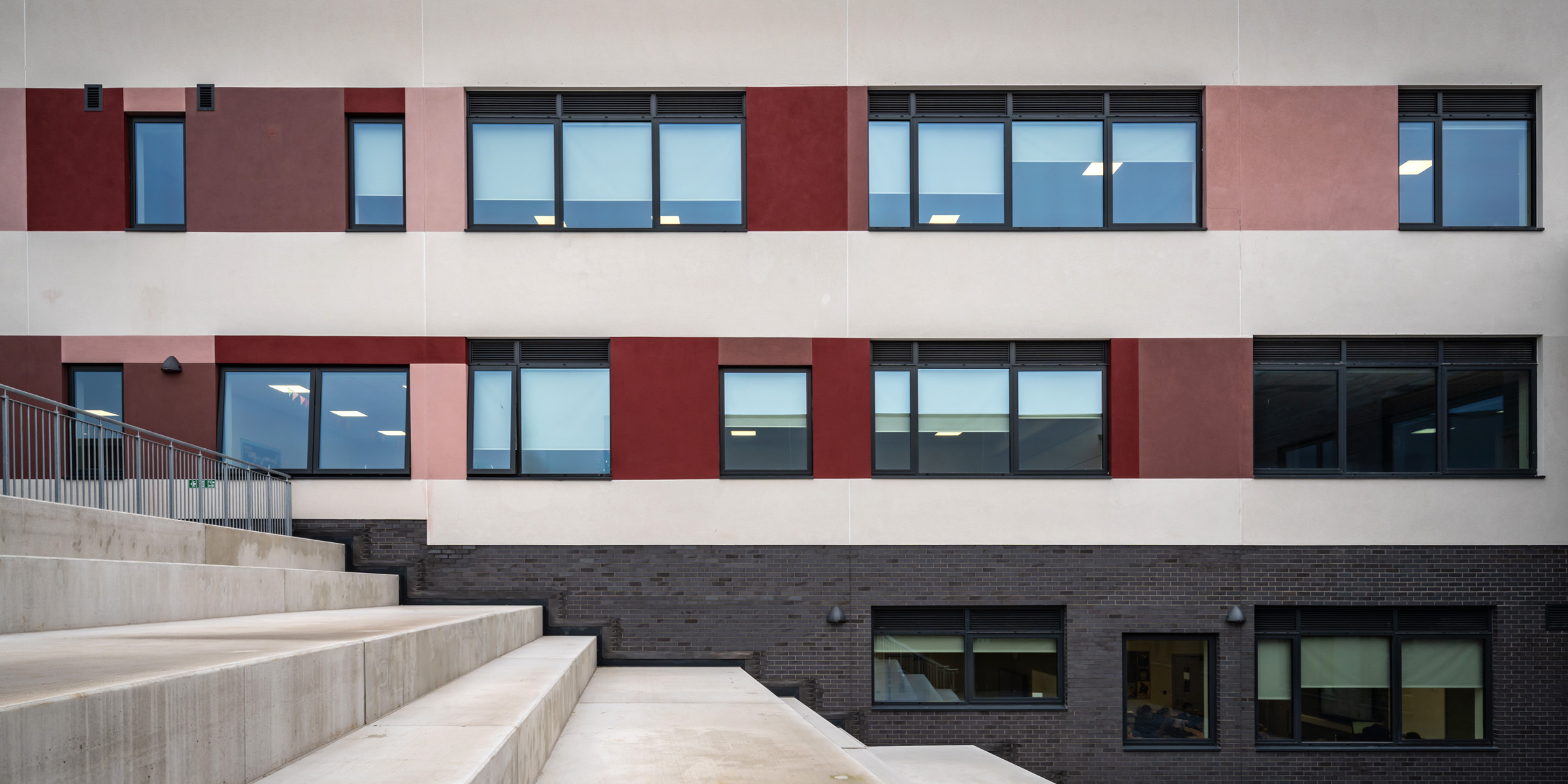 A stunning three-storey, 10,314m2 educational facility delivers 43 classrooms, plus Technology & Design Suite, dedicated study and wellbeing Sixth Form space, library with stunning views over Belfast Lough, along with state-of-the-art 3G games pitches, for over 700 staff and pupils. Photo Credits: Gareth Andrews Photography.